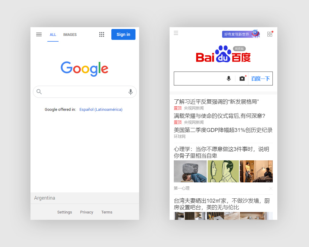 Even though there are many cluttered design examples, Chinese admire clean and simple layouts. Examples of this affirmation are popular web services like Baidu (Google alternative) and Weibo (Twitter counterpart). They both have designs that resemble the original ones of the Western hemisphere.